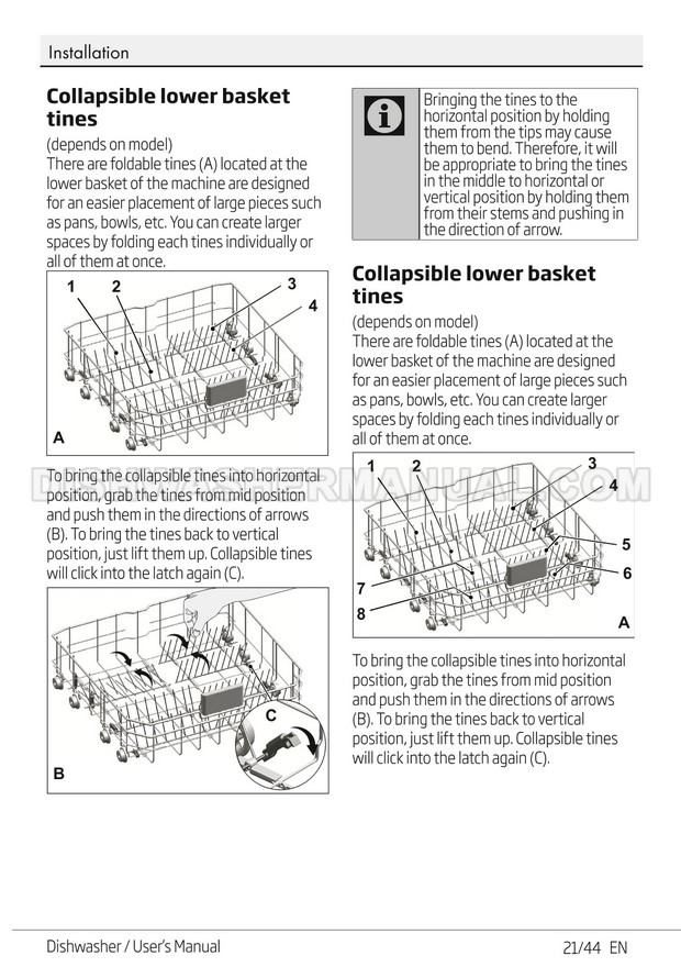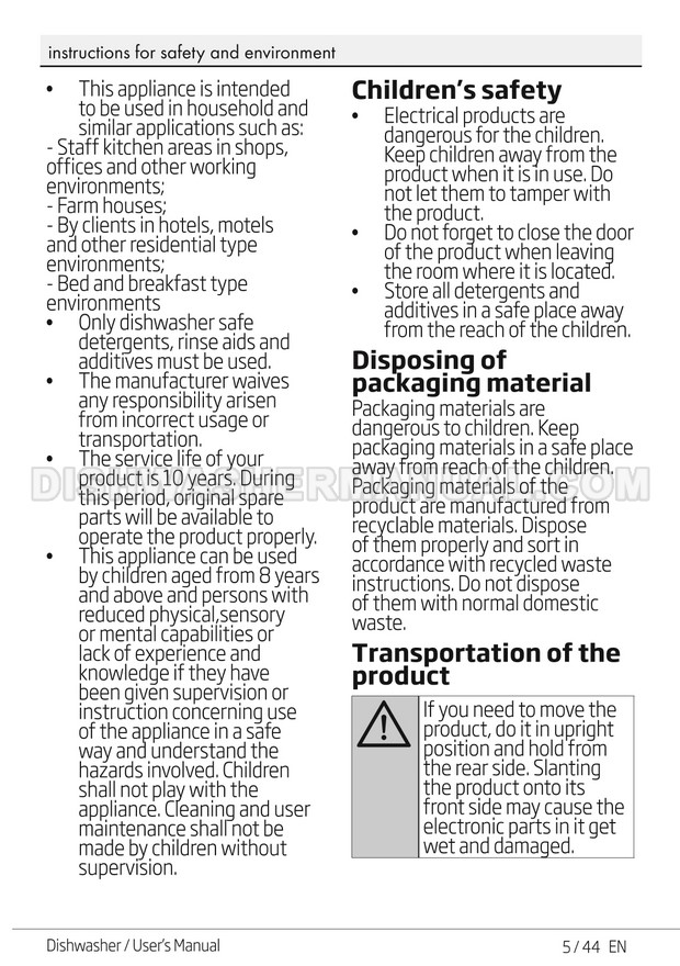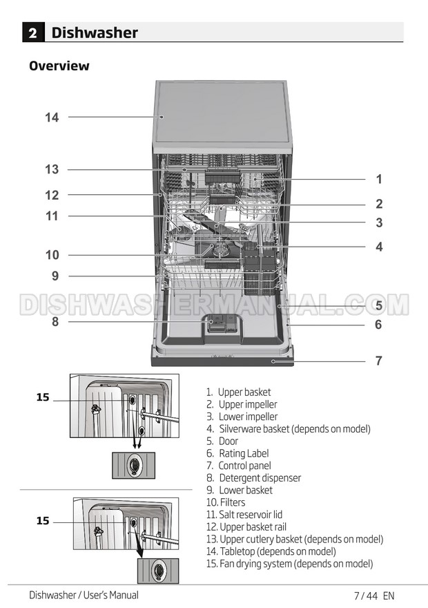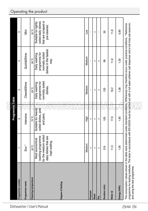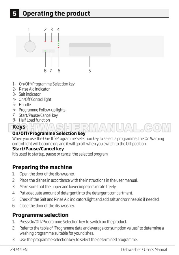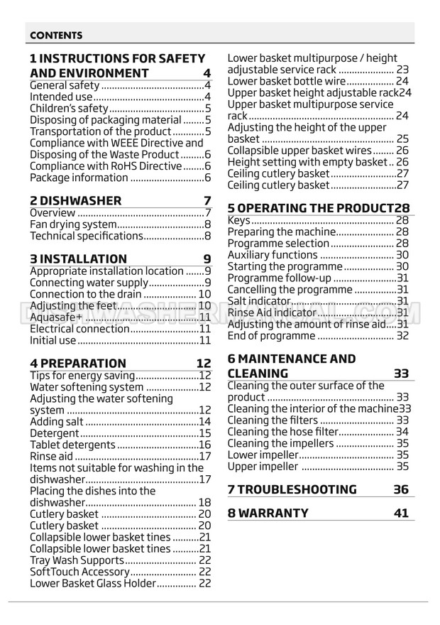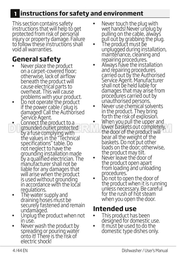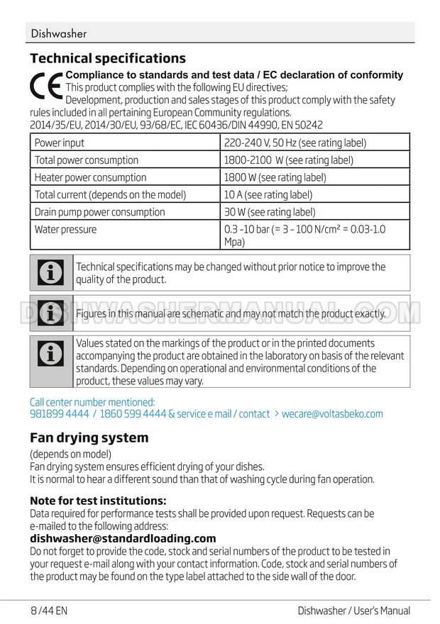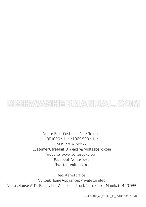 User's manual for Beko DF14W Voltas 60cm white 14 place setting full size dishwashing machine with front control on 45 pages.