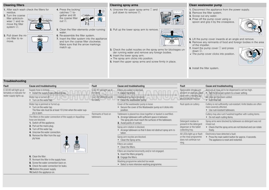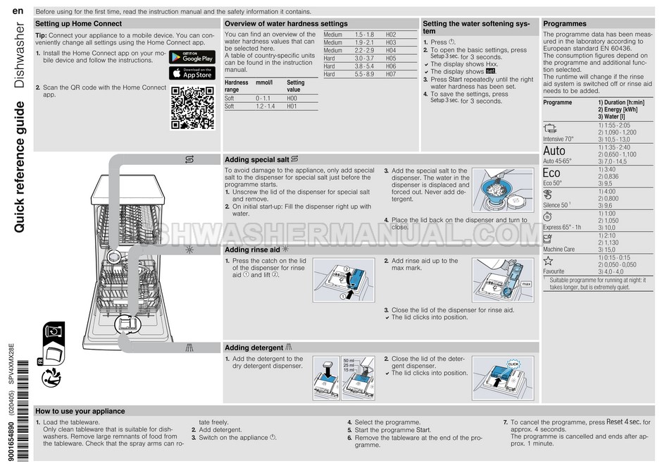 Quick reference guide for Bosch SPV4XMX28E (type SL4PW1B) 45cm built-in with Favourite function dishwashing machine with top control on 2 pages.